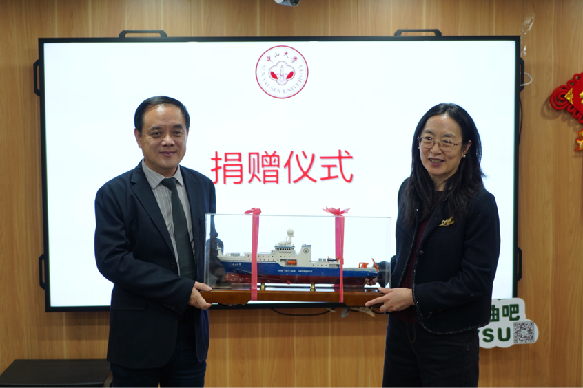 郑慧书记代表大气科学学院、海洋科学考察中心赠送“中山大学”号科考船船模等鸣谢纪念品。